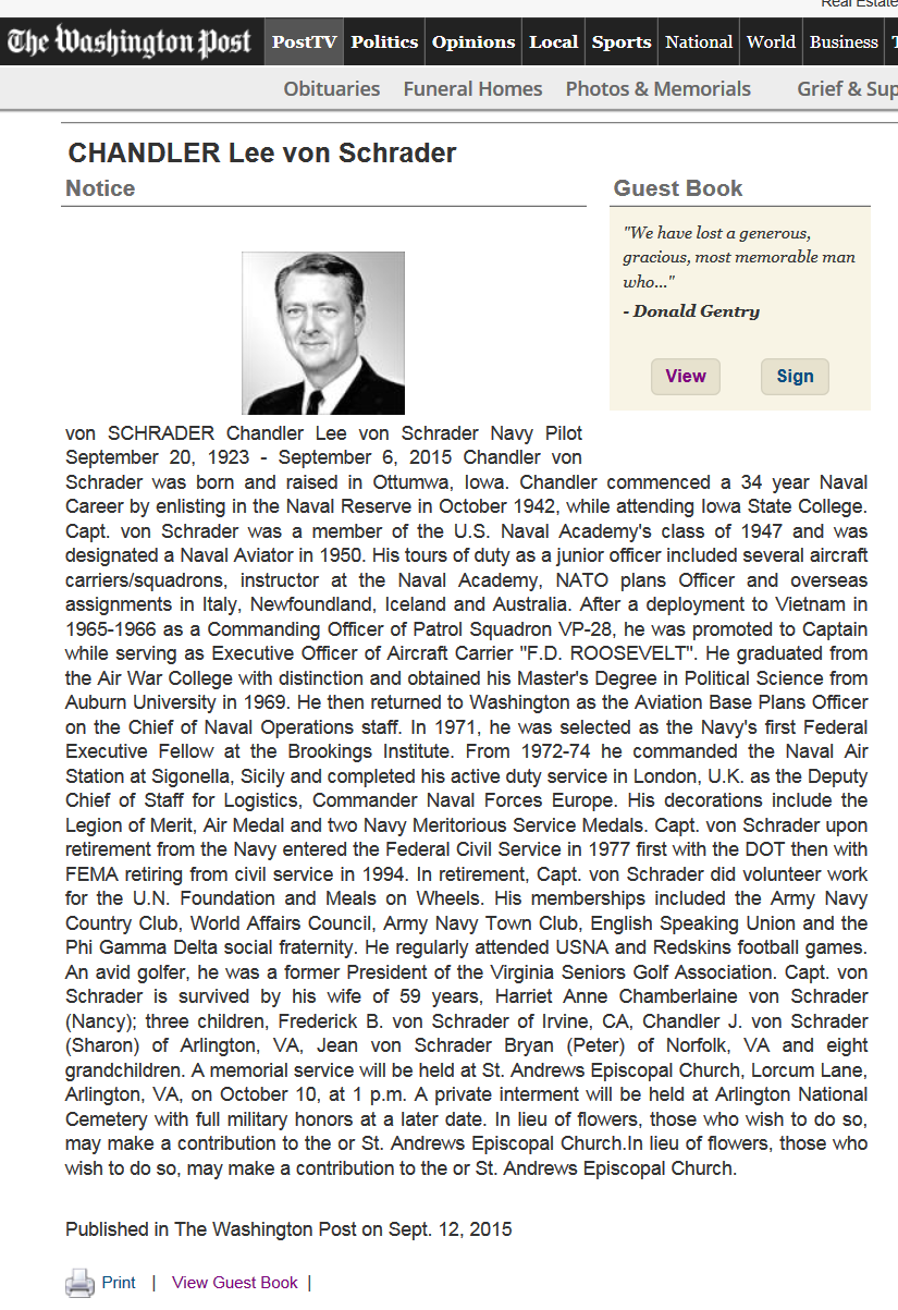 | von Schrader | Chandler Lee | 65-66 | CDR | 09/06/2015 | 09/14/2015 | See Roster OBITUARY |